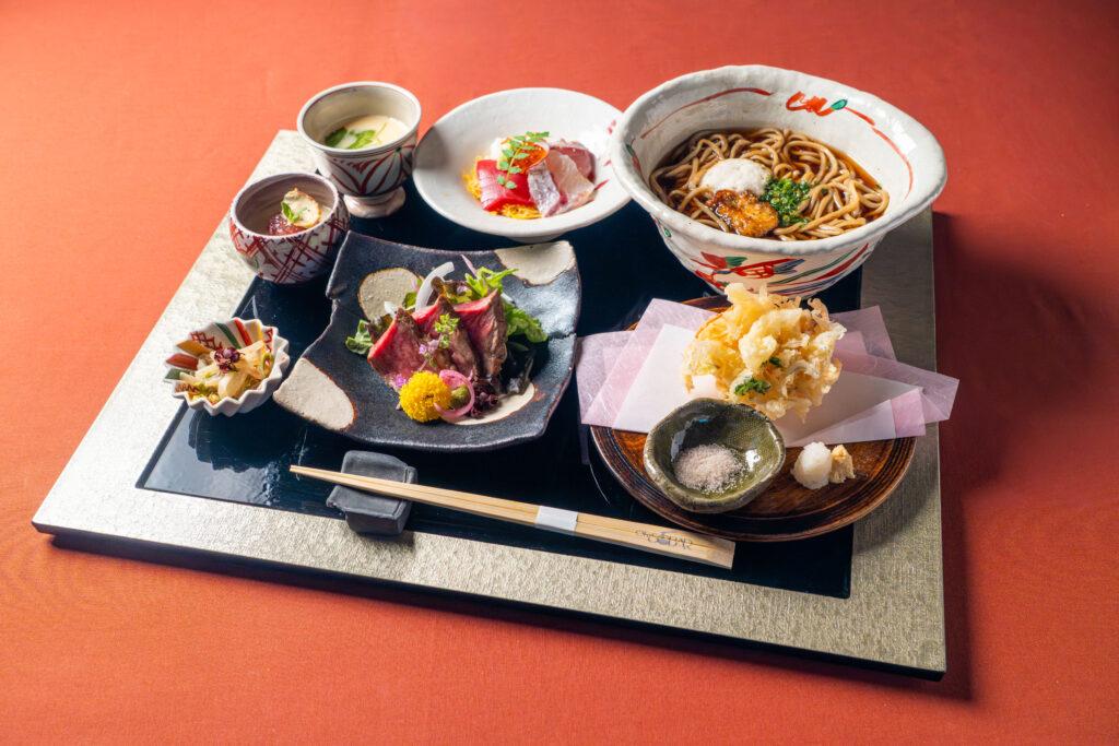 淡路島の旬食材を取り入れた四季折々の小料理に加え、伝統的な二八蕎麦、海藻の中でも特に栄養価が高い“アカモク”や、豊富なミネラルと食物繊維を含む“長命草”などを使用した“変わり蕎麦”を組み合わせた、これまでにない革新的なモダン蕎麦割烹をコースで提供いたします。