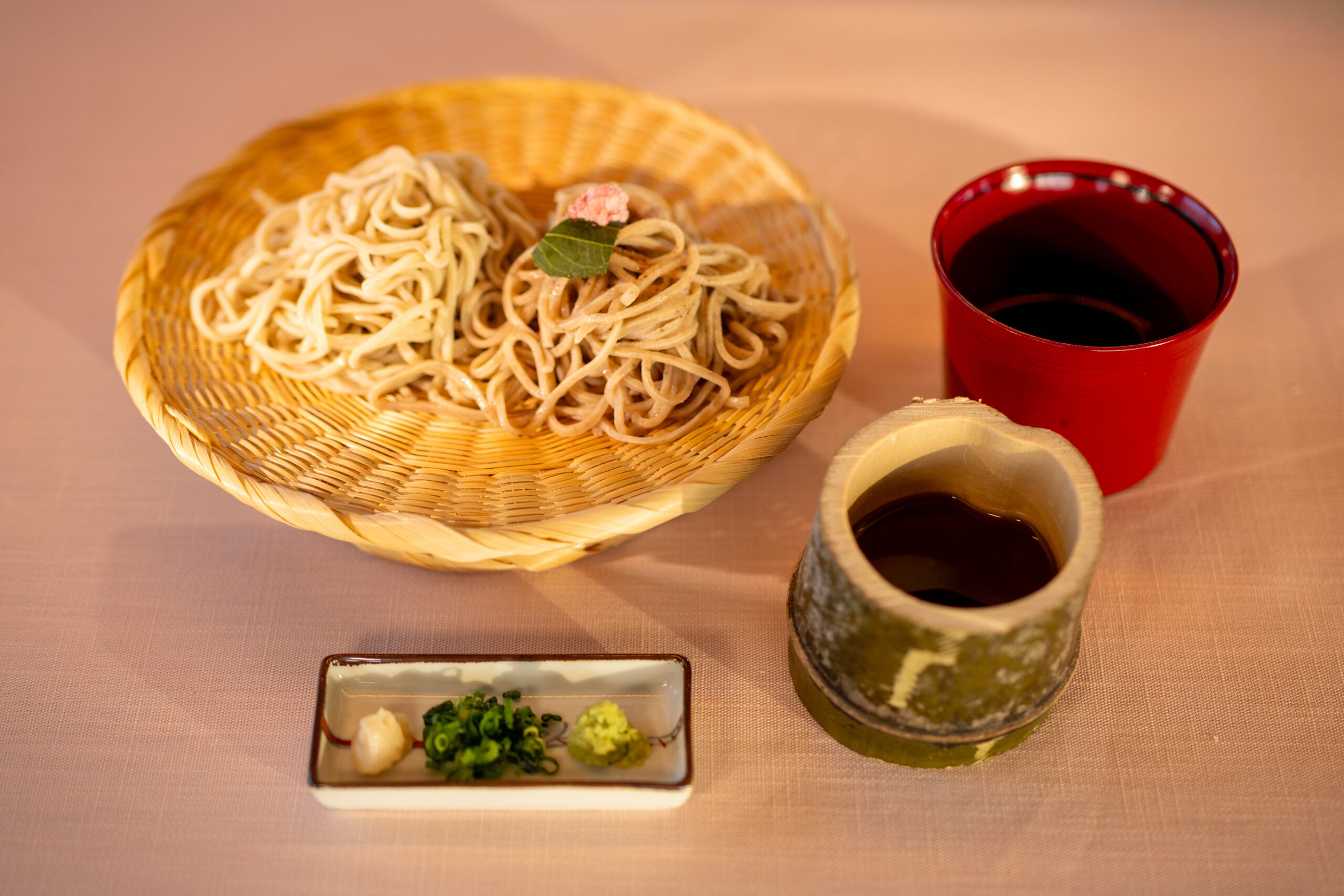 淡い桜色に仕上げた蕎麦は、